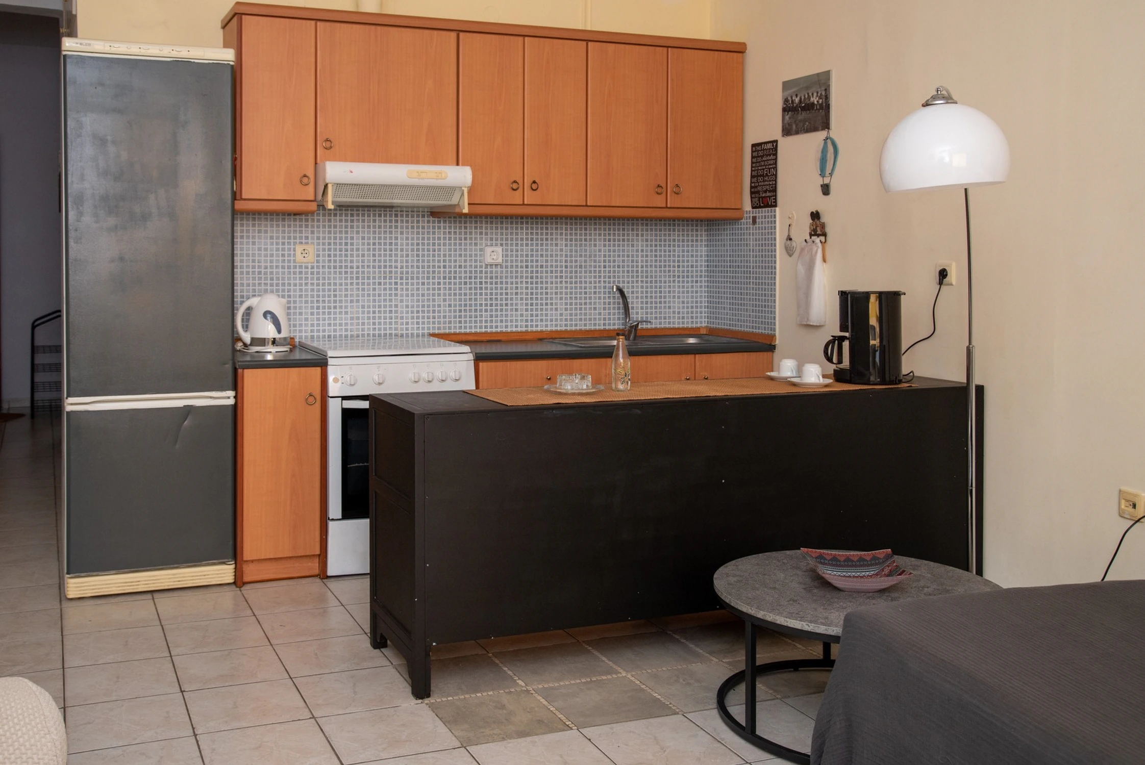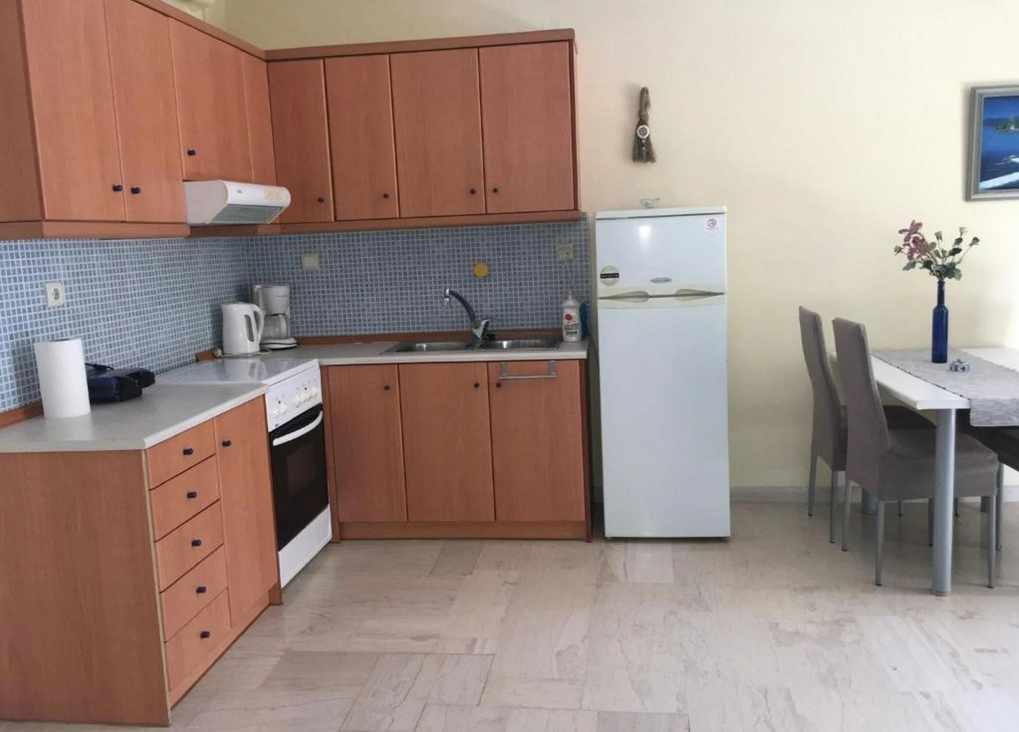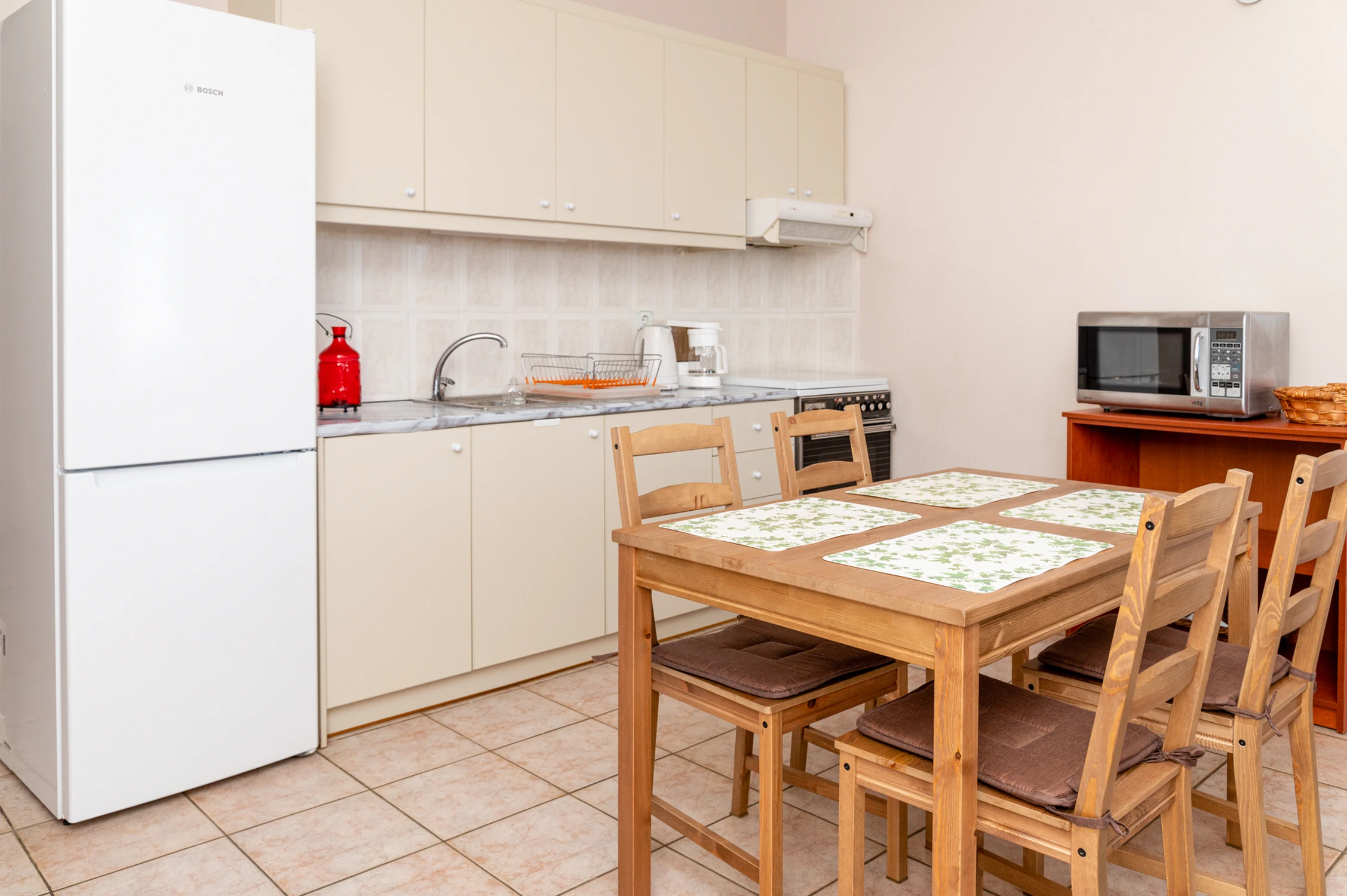 Kitchen: Dining table, Coffee machine, Cleaning products, Stovetop, Oven, Kitchenware, Electric kettle, Refrigerator