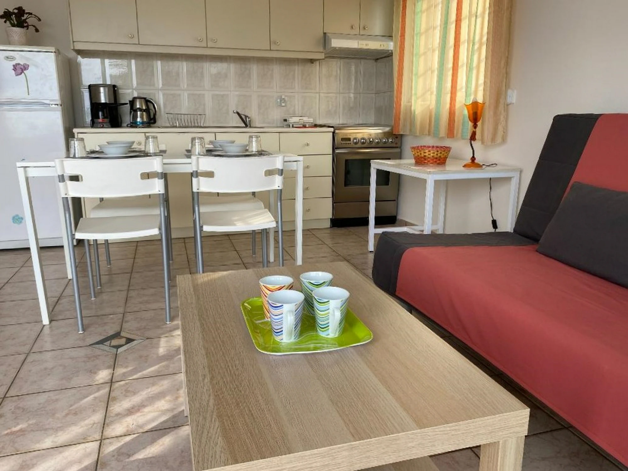 Kitchen: Dining table, Coffee machine, Cleaning products, Stovetop, Oven, Kitchenware, Electric kettle, Refrigerator